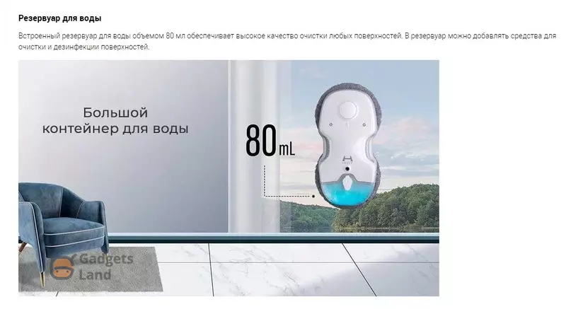Влажная очистка с достаточным количеством воды наиболее эффективна, робот быстро и качественно очищает стёкла от загрязнений, не оставляя следов, разводов. Робот-мойщик оснащён резервуаром для воды, которая при влажной очистке разбрызгивается вперед по ходу движения робота.